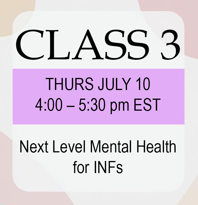 Mental Health for INFJs and INFPs is a three-week online class for INFJs and INFPs who are interested in examining mental health through an INF-specific lens. We will be learning about how to more consciously work with our mental health to alleviate depression and anxiety, and to avoid exhaustion and burnout.